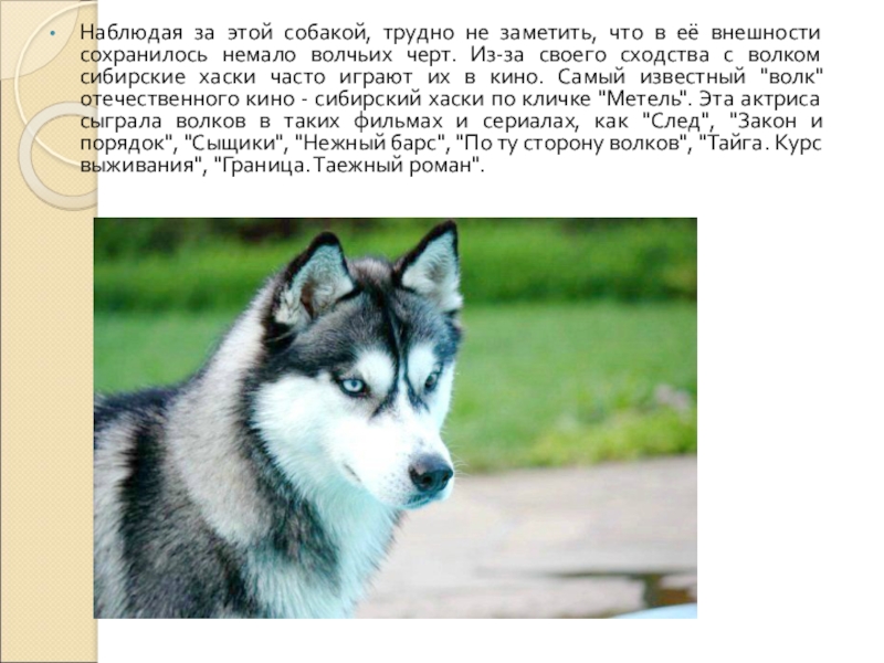 сохранилось немало волчьих черт. Из-за своего сходства с волком сибирские хаски часто играют их в кино. Самый известный "волк" отечественного кино - сибирский хаски по кличке "Метель". Эта актриса сыграла волков в таких фильмах и сериалах, как "След", "Закон и порядок", "Сыщики", "Нежный барс", "По ту сторону волков", "Тайга. Курс выживания", "Граница. Таежный роман".