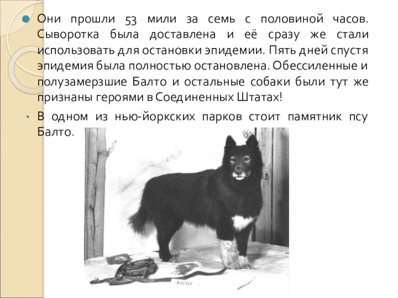 доставлена и её сразу же стали использовать для остановки эпидемии. Пять дней спустя эпидемия была полностью остановлена. Обессиленные и полузамерзшие Балто и остальные собаки были тут же признаны героями в Соединенных Штатах!