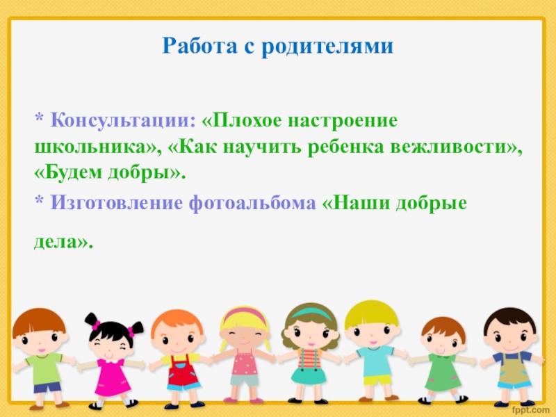 * Консультации: «Плохое настроение школьника», «Как научить ребенка вежливости», «Будем