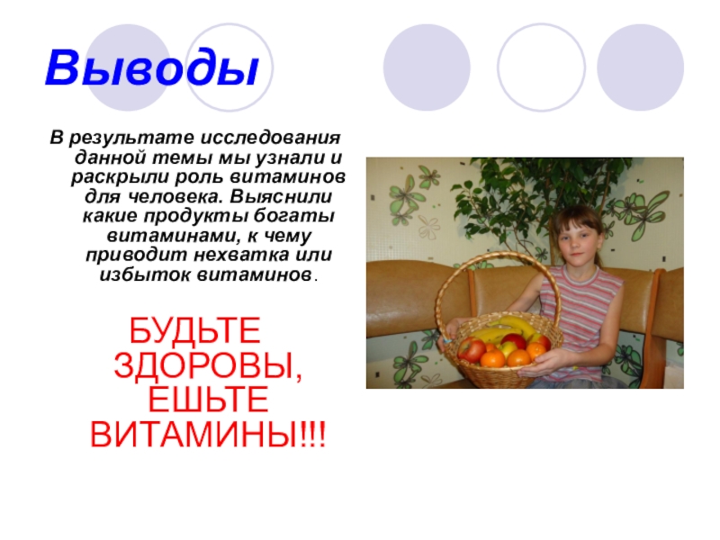 В результате исследования данной темы мы узнали и раскрыли роль витаминов