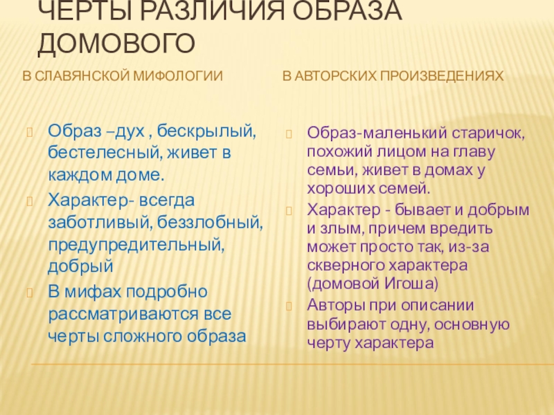 Характер - бывает и добрым и злым, причем вредить может просто так, из-за скверного характера(домовой Игоша)