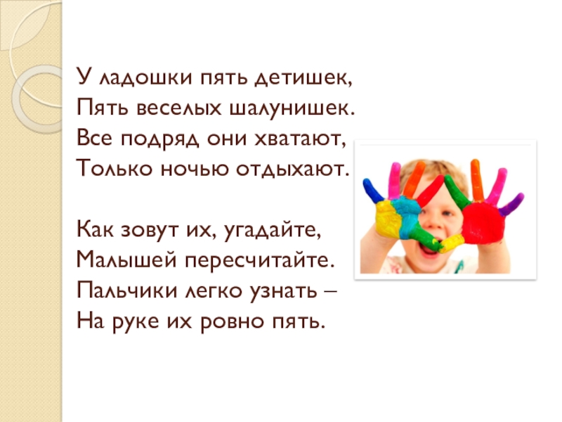 Слайд 4У ладошки пять детишек, Пять веселых шалунишек.       Все подряд