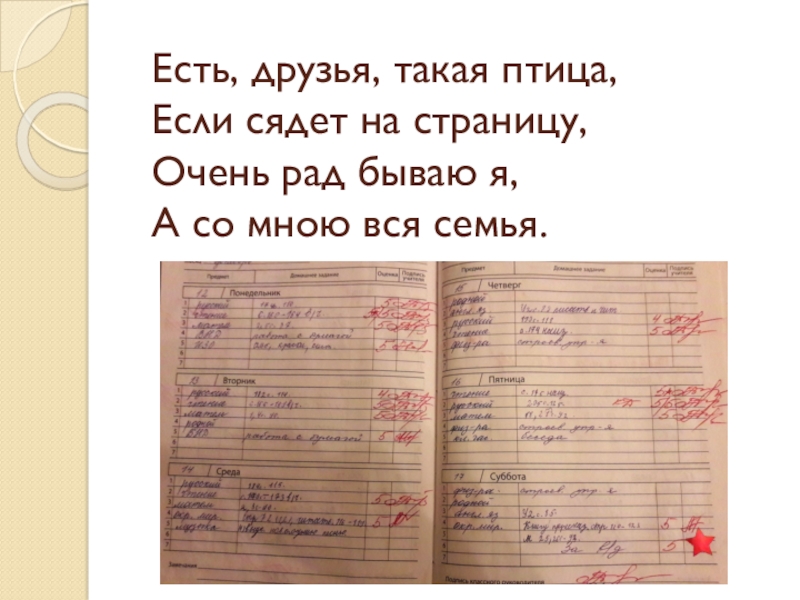 Есть, друзья, такая птица, Если сядет на страницу, Очень рад бываю я, А со мною вся семья.