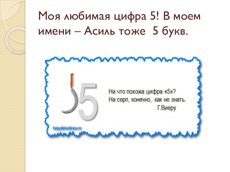 Слайд 2Моя любимая цифра 5! В моем имени – Асиль тоже 5