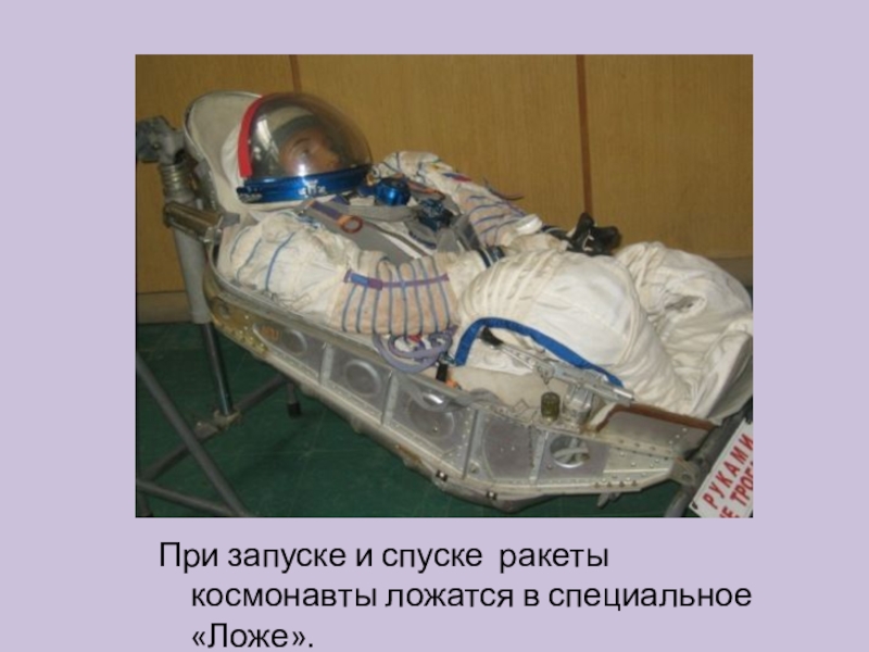 Слайд 18При запуске и спуске ракеты космонавты ложатся в специальное «Ложе».