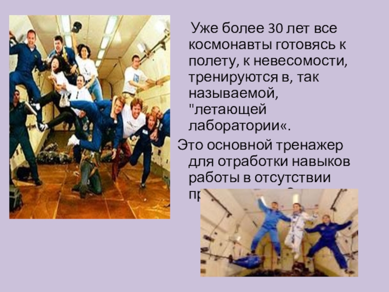 полету, к невесомости, тренируются в, так называемой, "летающей лаборатории«.