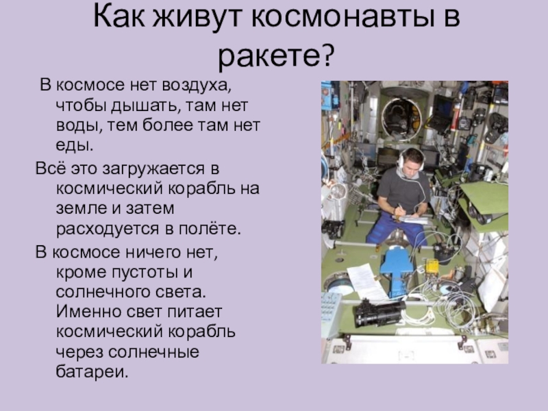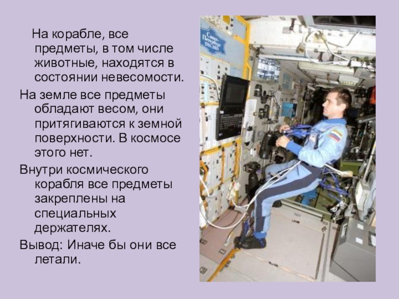 Внутри космического корабля все предметы закреплены на специальных держателях.
