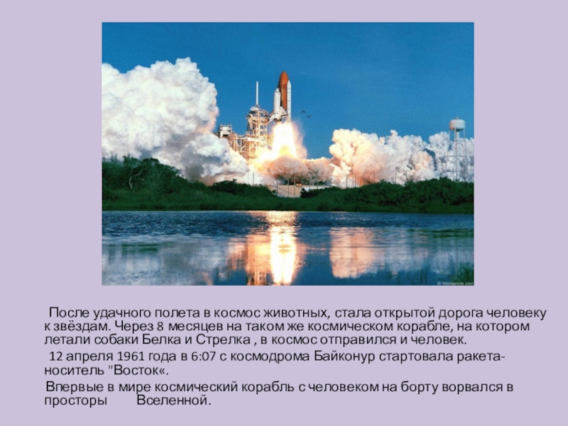открытой дорога человеку к звёздам. Через 8 месяцев на таком же космическом корабле, на котором летали собаки Белка и Стрелка , в космос отправился и человек.