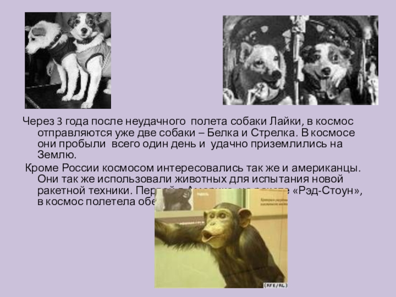 Слайд 7Через 3 года после неудачного полета собаки Лайки, в космос отправляются