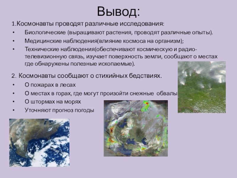 Технические наблюдения(обеспечивают космическую и радио-телевизионную связь, изучает поверхность земли, сообщают о местах где обнаружены полезные ископаемые).