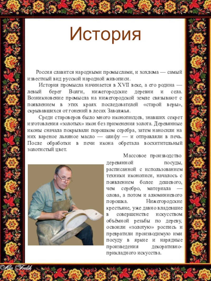 Массовое производство деревянной посуды, расписанной с использованием техники иконописи, началось с появлением более дешевого, чем серебро, материала — олова, а потом и алюминиевого порошка. Нижегородские крестьяне, уже давно владевшие в совершенстве искусством объёмной резьбы по дереву, освоили «золотую» роспись и превратили производимую ими посуду в яркие и нарядные произведения декоративно-прикладного искусства.