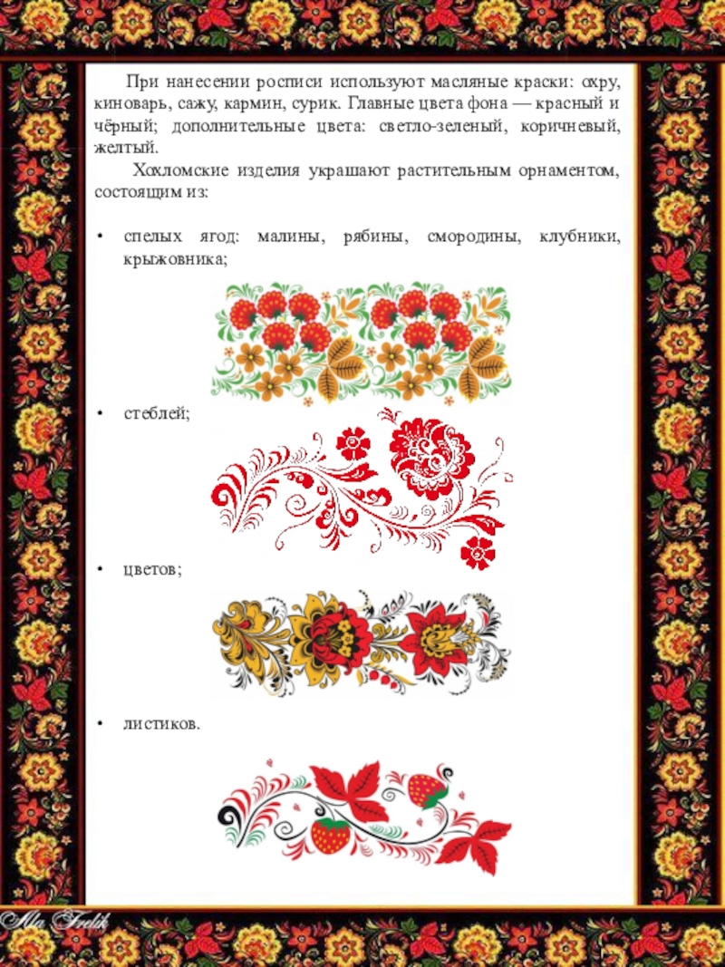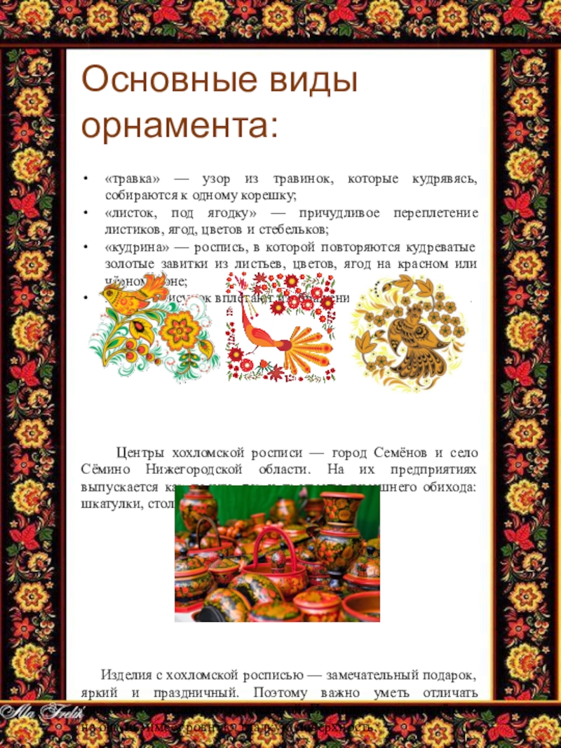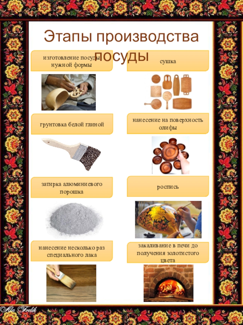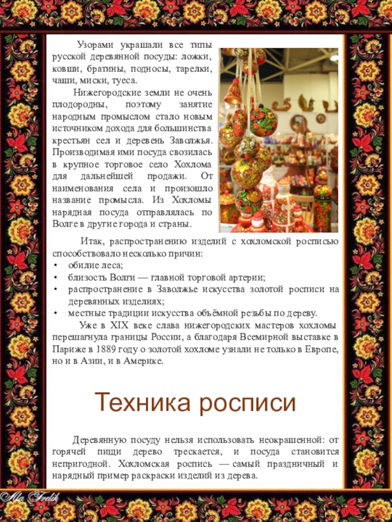 Деревянную посуду нельзя использовать неокрашенной: от горячей пищи дерево трескается, и посуда становится непригодной. Хохломская роспись — самый праздничный и нарядный пример раскраски изделий из дерева.