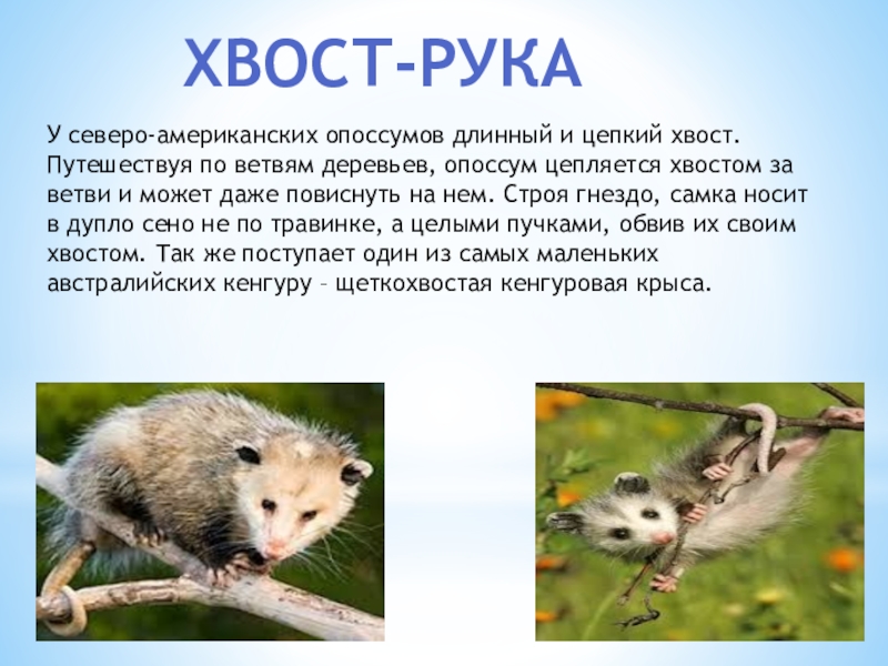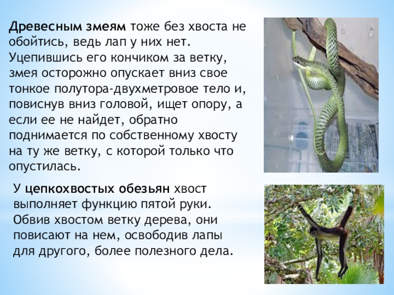 У цепкохвостых обезьян хвост выполняет функцию пятой руки. Обвив хвостом ветку дерева, они повисают на нем, освободив лапы для другого, более полезного дела.