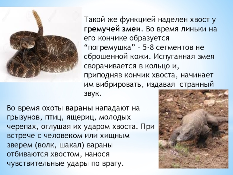 Во время охоты вараны нападают на грызунов, птиц, ящериц, молодых черепах, оглушая их ударом хвоста. При встрече с человеком или хищным зверем (волк, шакал) вараны отбиваются хвостом, нанося чувствительные удары по врагу.
