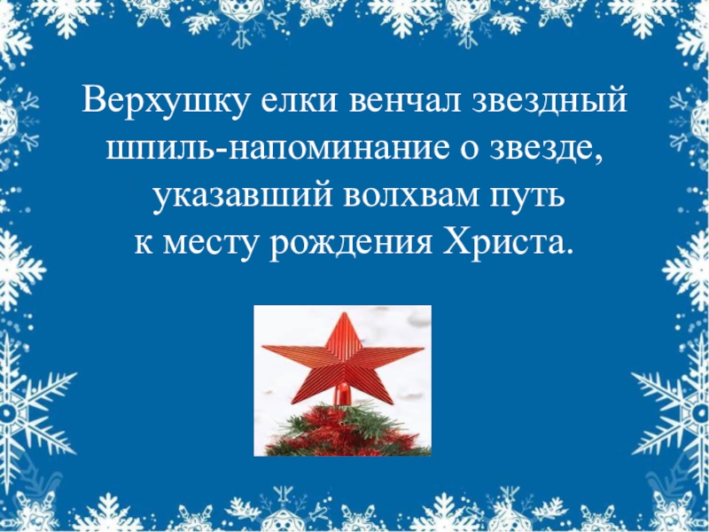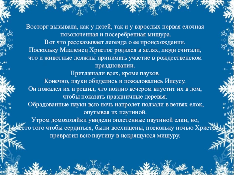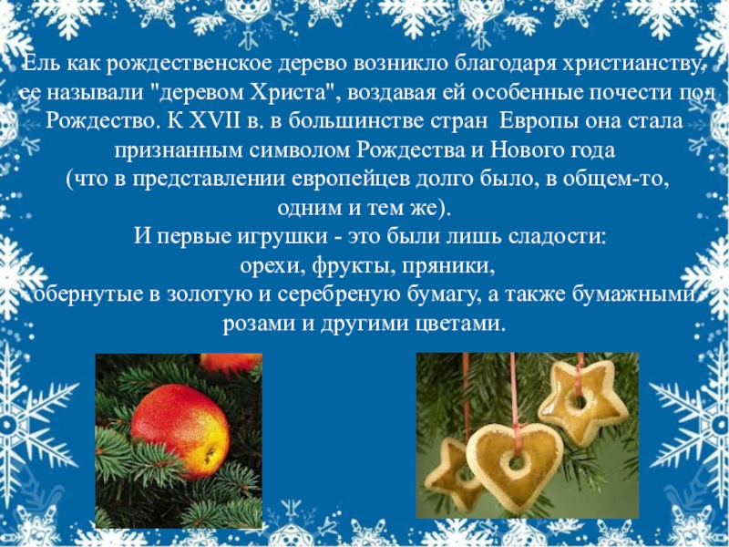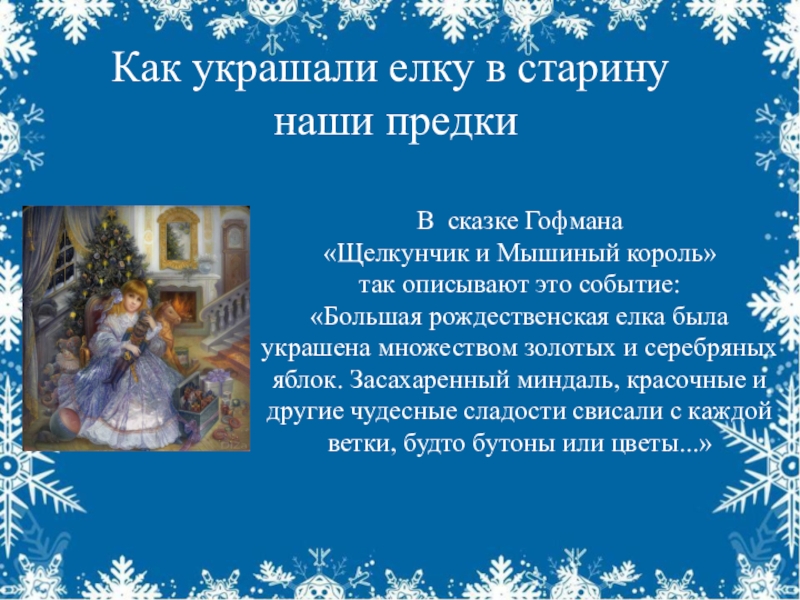 «Большая рождественская елка была украшена множеством золотых и серебряных яблок. Засахаренный миндаль, красочные и другие чудесные сладости свисали с каждой ветки, будто бутоны или цветы...»