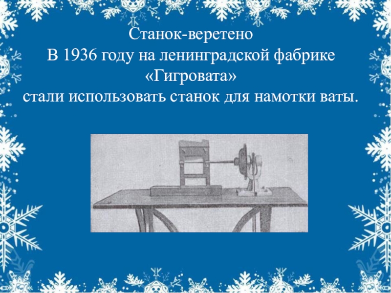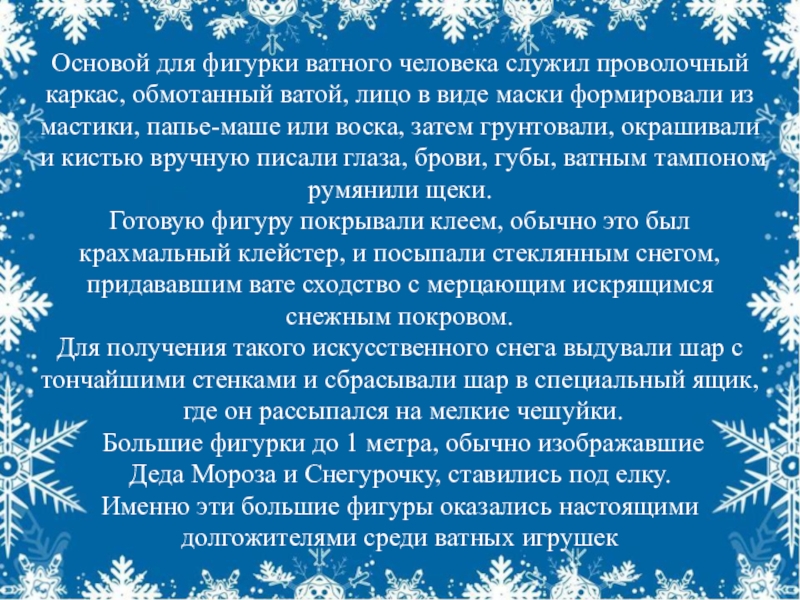 Слайд 13Основой для фигурки ватного человека служил проволочный каркас, обмотанный ватой, лицо