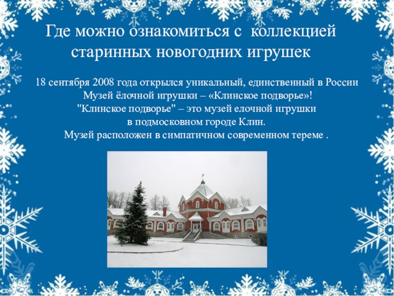 Слайд 41Где можно ознакомиться с коллекцией старинных новогодних игрушек