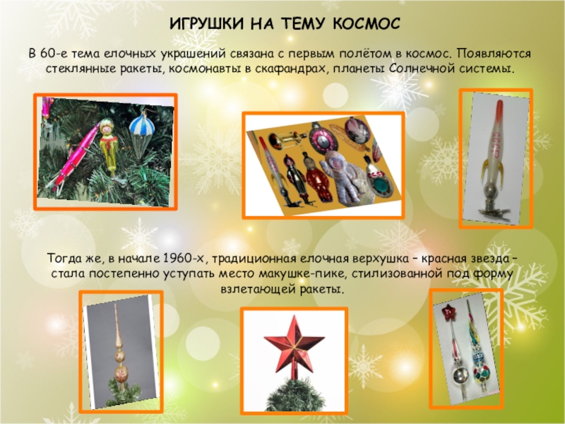 Тогда же, в начале 1960-х, традиционная елочная верхушка – красная звезда – стала постепенно уступать место макушке-пике, стилизованной под форму взлетающей ракеты.