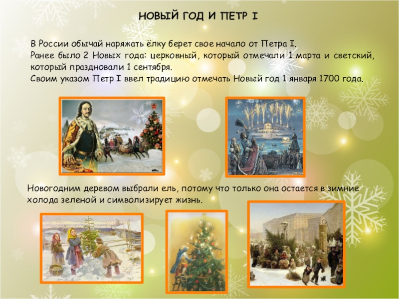 Новогодним деревом выбрали ель, потому что только она остается в зимние холода зеленой и символизирует жизнь.