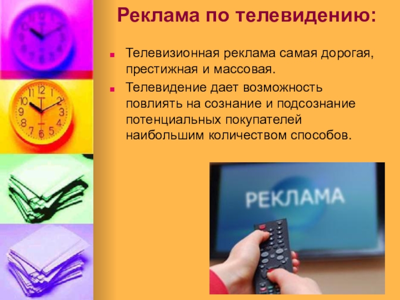 Слайд 10Реклама по телевидению: