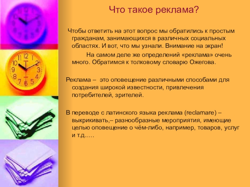 На самом деле же определений «реклама» очень много. Обратимся к толковому словарю Ожегова.