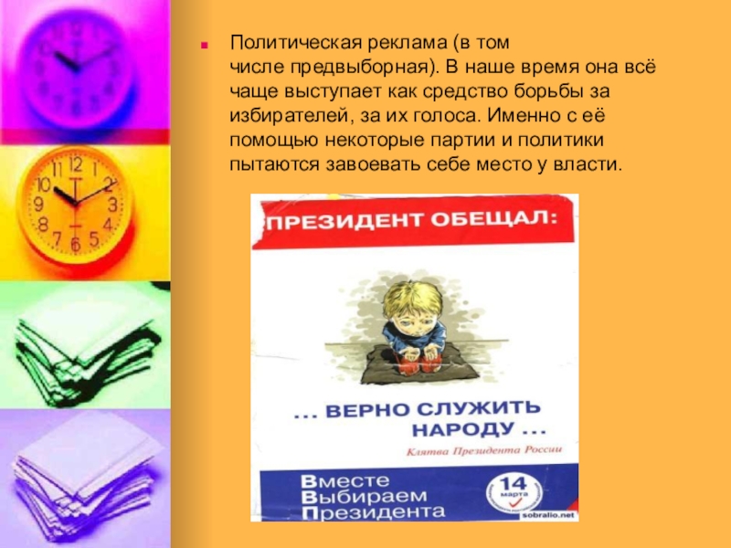 Слайд 16Политическая реклама (в том числе предвыборная). В наше время она всё чаще