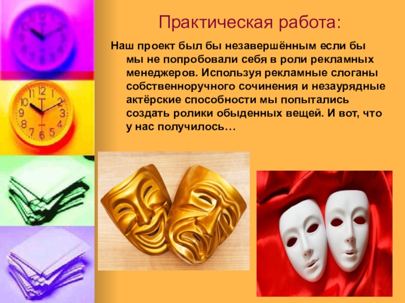 себя в роли рекламных менеджеров. Используя рекламные слоганы собственноручного сочинения и незаурядные актёрские способности мы попытались создать ролики обыденных вещей. И вот, что у нас получилось…