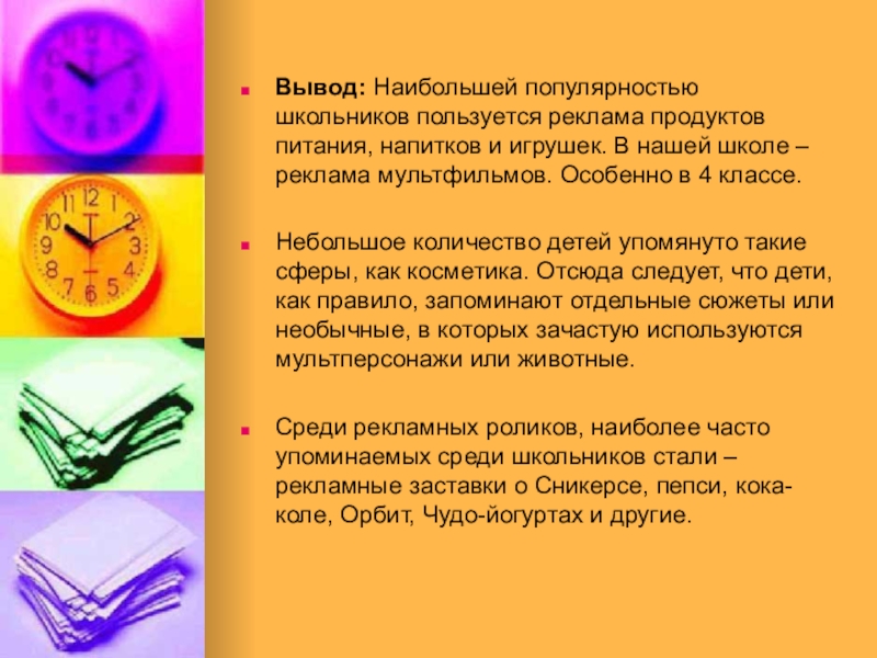 Среди рекламных роликов, наиболее часто упоминаемых среди школьников стали – рекламные заставки о Сникерсе, пепси, кока-коле, Орбит, Чудо-йогуртах и другие.