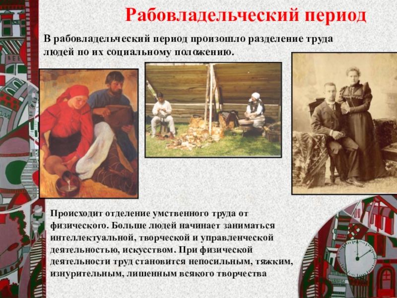 Происходит отделение умственного труда от физического. Больше людей начинает заниматься интеллектуальной, творческой и управленческой деятельностью, искусством. При физической деятельности труд становится непосильным, тяжким, изнурительным, лишенным всякого творчества