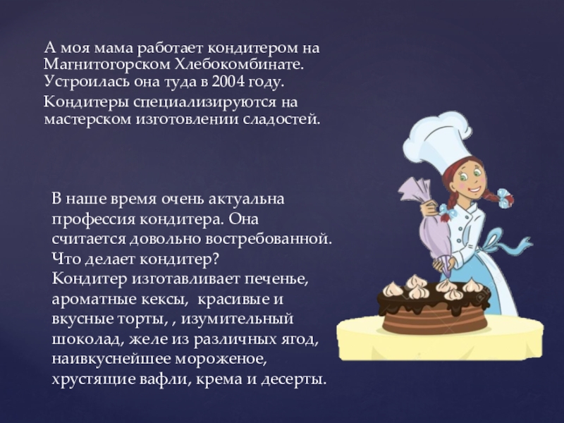 В наше время очень актуальна профессия кондитера. Она считается довольно востребованной. Что делает кондитер?