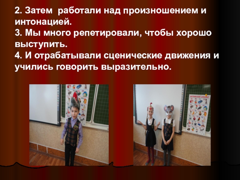2. Затем работали над произношением и интонацией.3. Мы много репетировали, чтобы хорошо выступить.4. И отрабатывали сценические движения