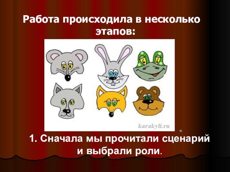 Работа происходила в несколько этапов:1. Сначала мы прочитали сценарий и выбрали роли.