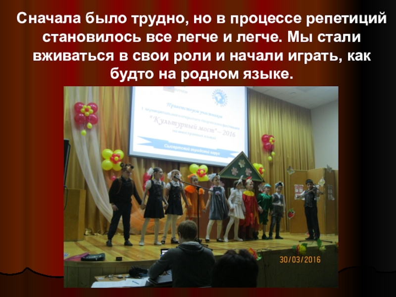 Слайд 13Сначала было трудно, но в процессе репетиций становилось все легче и