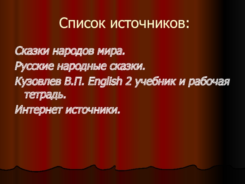 Список источников:Сказки народов мира.Русские народные сказки.Кузовлев В.П. English 2 учебник и рабочая тетрадь.Интернет источники.