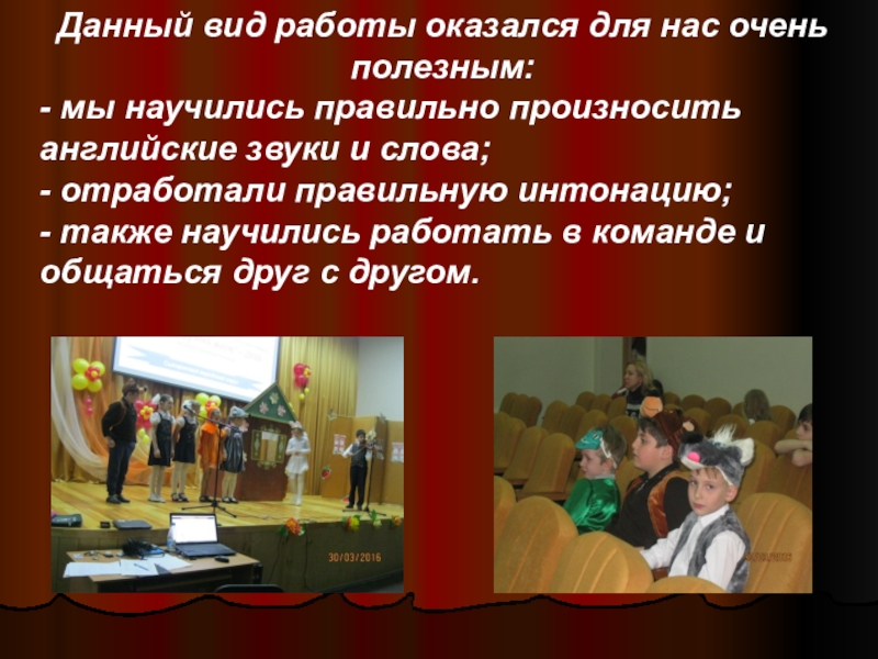 Данный вид работы оказался для нас очень полезным:- мы научились правильно произносить английские звуки и слова; -