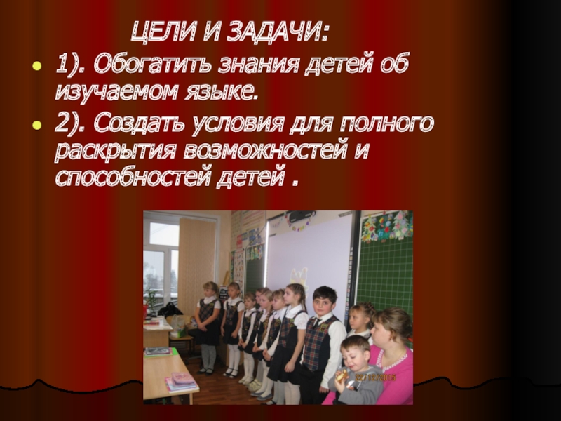 ЦЕЛИ И ЗАДАЧИ:1). Обогатить знания детей об изучаемом языке.2). Создать