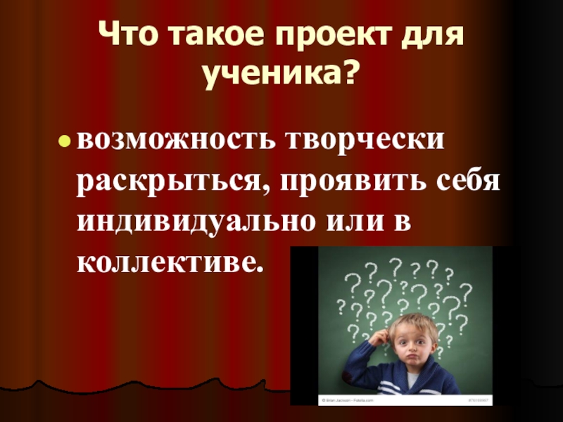 возможность творчески раскрыться, проявить себя индивидуально или в коллективе.Что такое проект для ученика?