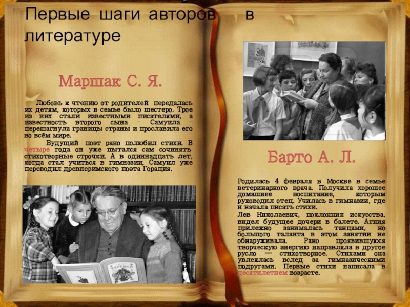 Любовь к чтению от родителей передалась их детям, которых в семье было шестеро. Трое из них стали известными писателями, а известность второго сына - Самуила – перешагнула границы страны и прославила его во всём мире.