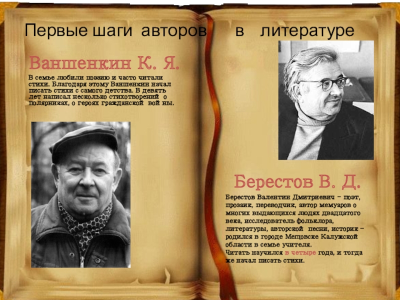 Берестов Валентин Дмитриевич - поэт, прозаик, переводчик, автор мемуаров о многих выдающихся людях двадцатого века, исследователь фольклора, литературы, авторской песни, историк – родился в городе Мещовске Калужской области в семье учителя.