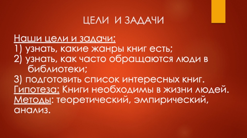 ЦЕЛИ И ЗАДАЧИ Наши цели и задачи: 1) узнать, какие жанры книг есть; 2) узнать, как часто обращаются люди в библиотеки;3) подготовить список интересных книг.Гипотеза: Книги необходимы в жизни людей.Методы: теоретический, эмпирический, анализ.