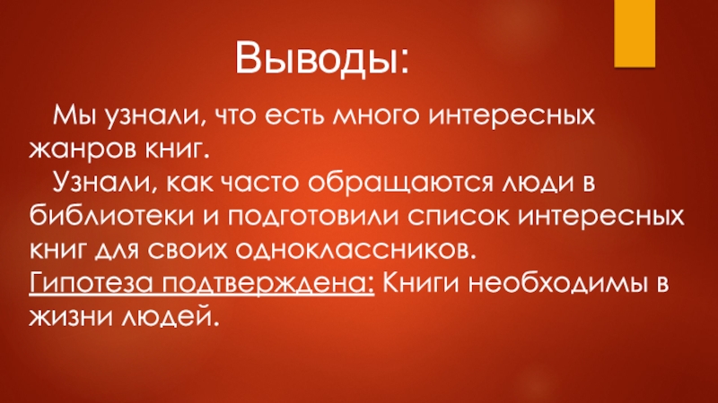 Выводы:  Мы узнали, что есть много интересных жанров книг.  Узнали, как часто обращаются люди в
