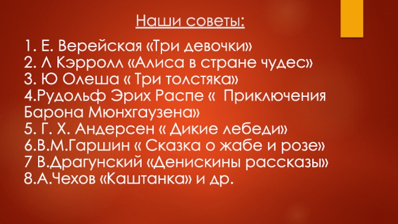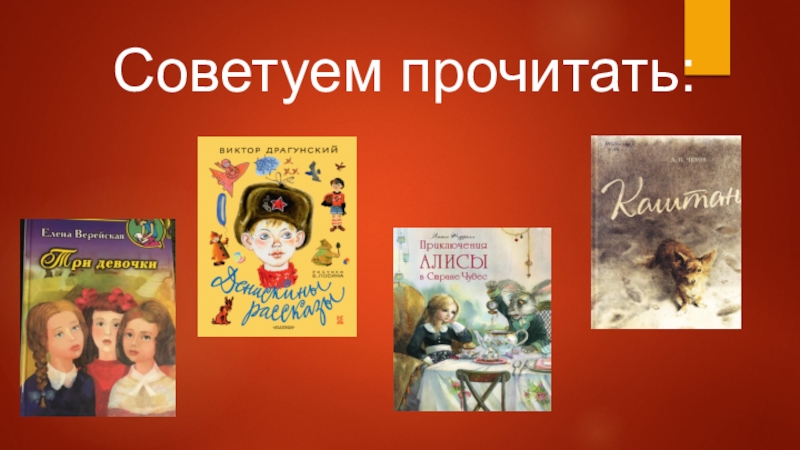 Наши советы:1. Е. Верейская «Три девочки» 2. Л Кэрролл «Алиса в стране чудес»3. Ю Олеша « Три