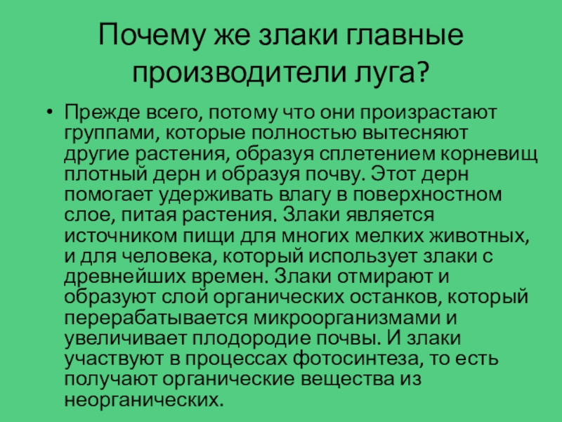 группами, которые полностью вытесняют другие растения, образуя сплетением корневищ плотный дерн и образуя почву. Этот дерн помогает удерживать влагу в поверхностном слое, питая растения. Злаки является источником пищи для многих мелких животных, и для человека, который использует злаки с древнейших времен. Злаки отмирают и образуют слой органических останков, который перерабатывается микроорганизмами и увеличивает плодородие почвы. И злаки участвуют в процессах фотосинтеза, то есть получают органические вещества из неорганических.