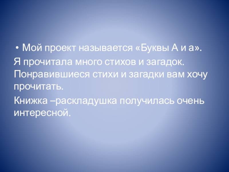 Мой проект называется «Буквы А и а».Я прочитала много стихов и загадок. Понравившиеся стихи и загадки вам хочу прочитать.Книжка –раскладушка получилась очень интересной.