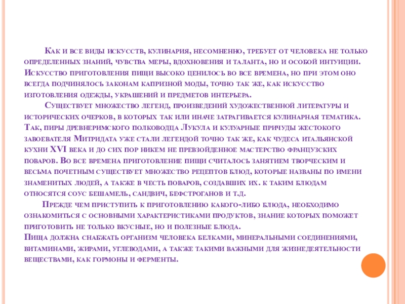 Слайд 2Как и все виды искусств, кулинария, несомненно, требует от человека не