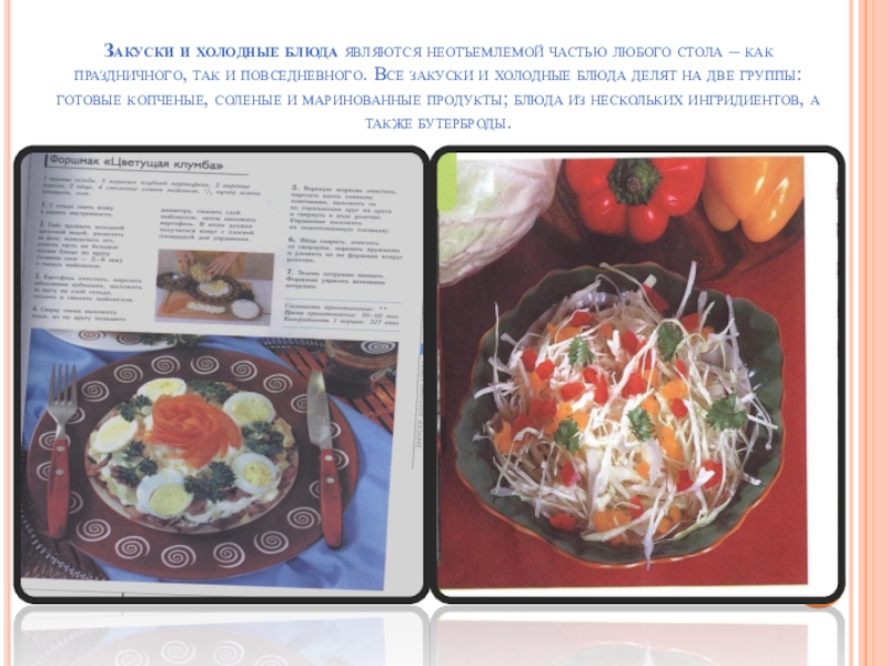 праздничного, так и повседневного. Все закуски и холодные блюда делят на две группы: готовые копченые, соленые и маринованные продукты; блюда из нескольких ингридиентов, а также бутерброды.