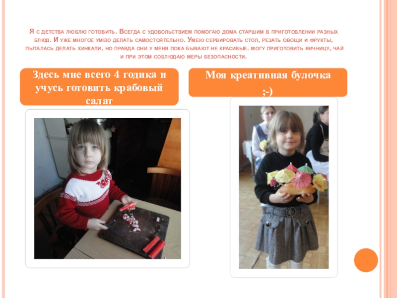 Слайд 13Я с детства люблю готовить. Всегда с удовольствием помогаю дома старшим