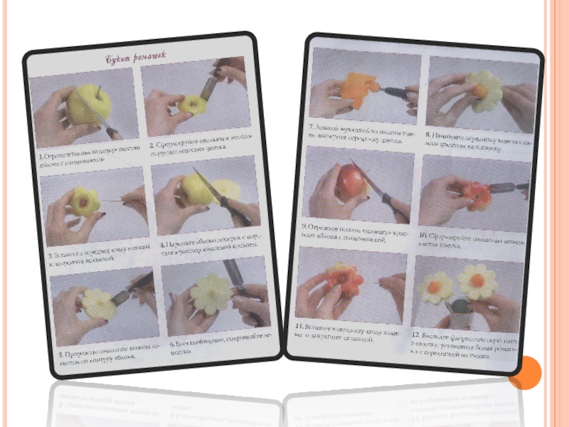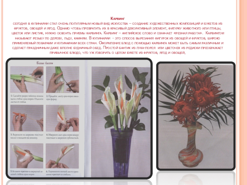 художественных композиций и букетов из фруктов, овощей и ягод. Однако чтобы превратить их в красивый декоративный элемент, фигурку животного или птицы, цветок или листик, нужно освоить приемы карвинга. Карвинг – английское слово и означает «резная работа». Карвингом называют резьбу по дереву, льду, камням. В кулинарии - это способ вырезания фигурок из овощей и фруктов, широко применяемый поварами и кулинарами всех стран. Оформление блюд с помощью карвинга может быть самым различным и сделает праздничным даже вполне будничный обед. Простой бантик из лука-порея или цветочек из редиски преображает привычное блюдо, что уж говорить о целом букете из фруктов, ягод и овощей,