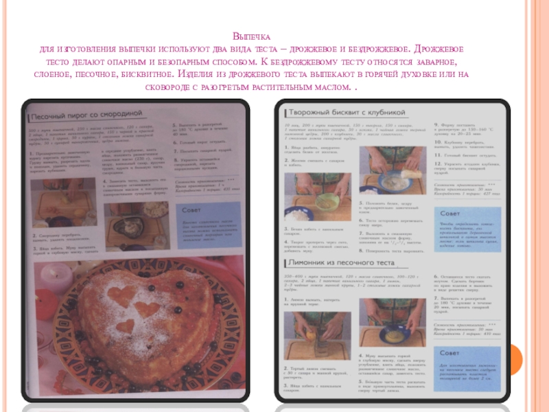 Дрожжевое тесто делают опарным и безопарным способом. К бездрожжевому тесту относятся заварное, слоеное, песочное, бисквитное. Изделия из дрожжевого теста выпекают в горячей духовке или на сковороде с разогретым растительным маслом. .