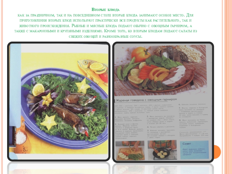 занимают особое место. Для приготовления вторых блюд используют практически все продукты как растительного, так и животного происхождения. Рыбные и мясные блюда подают обычно с овощным гарниром, а также с макаронными и крупяными изделиями. Кроме того, ко вторым блюдам подают салаты из свежих овощей и разнообразные соусы.